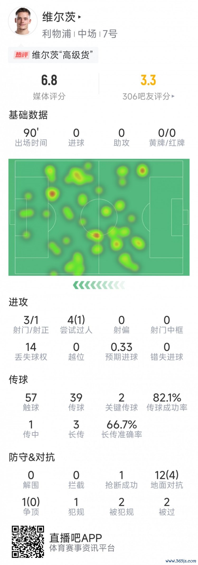 10月1日讯 在本轮欧冠,利物浦0-1不敌加拉塔萨雷。以下为维尔茨本场数据: