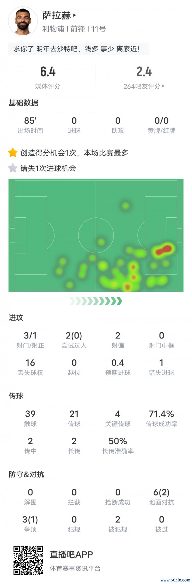 利物浦球员萨拉赫的全场数据方面,3次射门1次射正,2次过东谈主沿路失败,传球见遵循71.4%,1次错失进球,丢失球权16次。