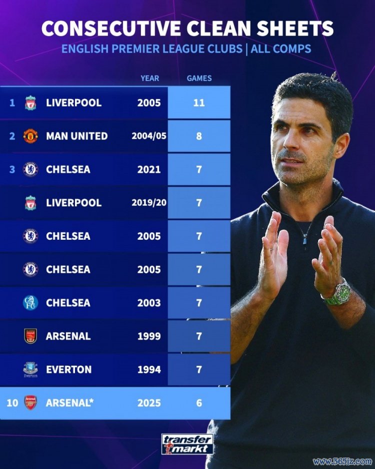 英超球队各项赛事最长零封榜:(*刻下仍未拔除)