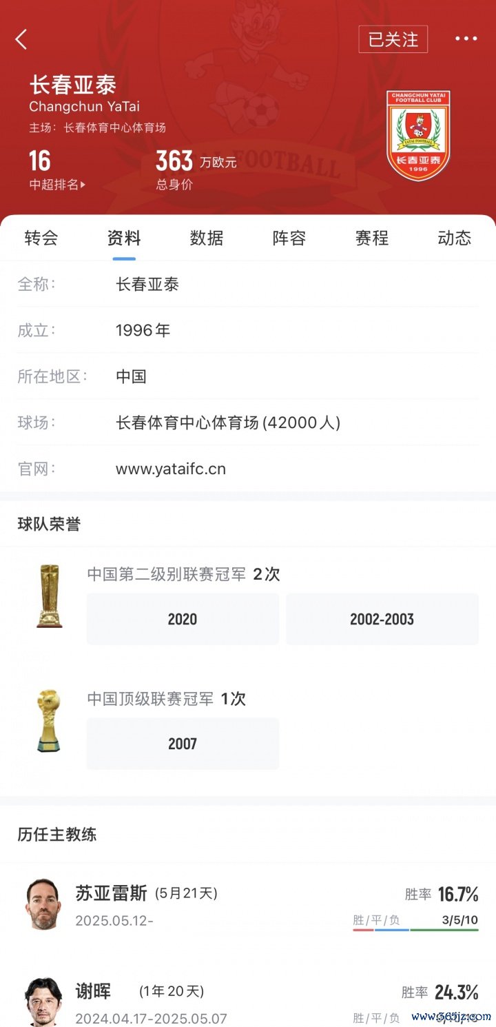 长春亚泰2006岁首度升入中超,2007年首夺中超冠军。2018年,亚泰在与重庆斯威、天津泰达同积32分条款下,因相互战绩差而遭左迁。长春亚泰成为继中超元年的深圳健力宝之后,第二支左迁的中超冠军球队。