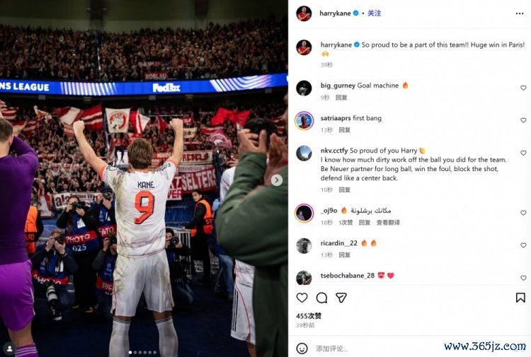 11月5日讯 拜仁在本轮欧冠焦点战2-1力克巴黎,凯恩在赛后通过社媒庆祝班师。