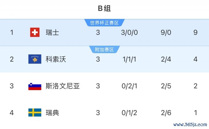 10月11日讯 世初赛欧洲区小组赛B组第3轮,瑞典0-2不敌瑞士,科索沃0-0斯洛文尼亚。