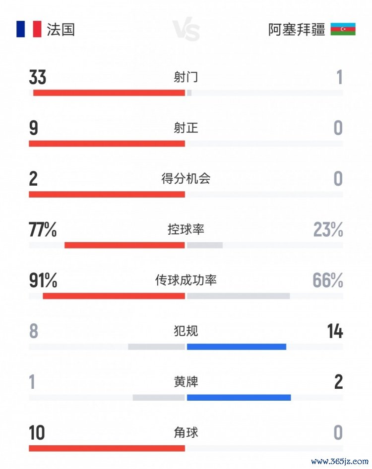 10月11日讯 本轮世初赛,法国3-0阿塞拜疆。两边全场要点数据对比如下↓(主队法国在前)