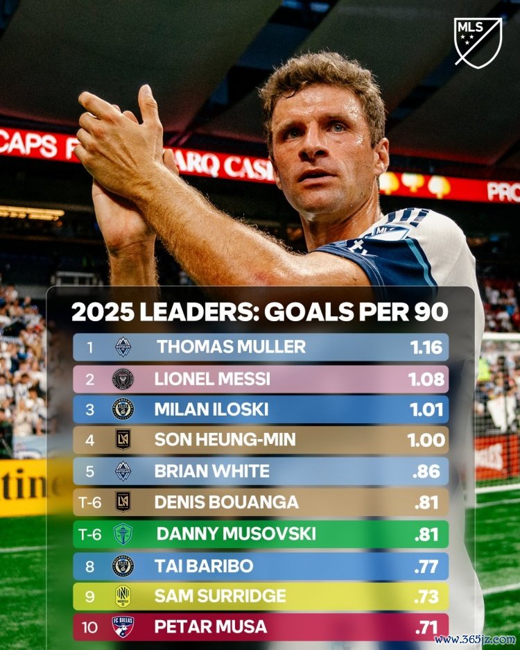 10月22日讯 好意思职联官方统计了球员本赛季每90分钟的进球数目,并排出榜单,穆勒居首,梅西次席。