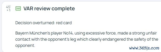“决定推翻:红牌。拜仁14号球员使用过度力量,与对方球员腿部发生明显不正大战斗,严重危及对方球员安全。”