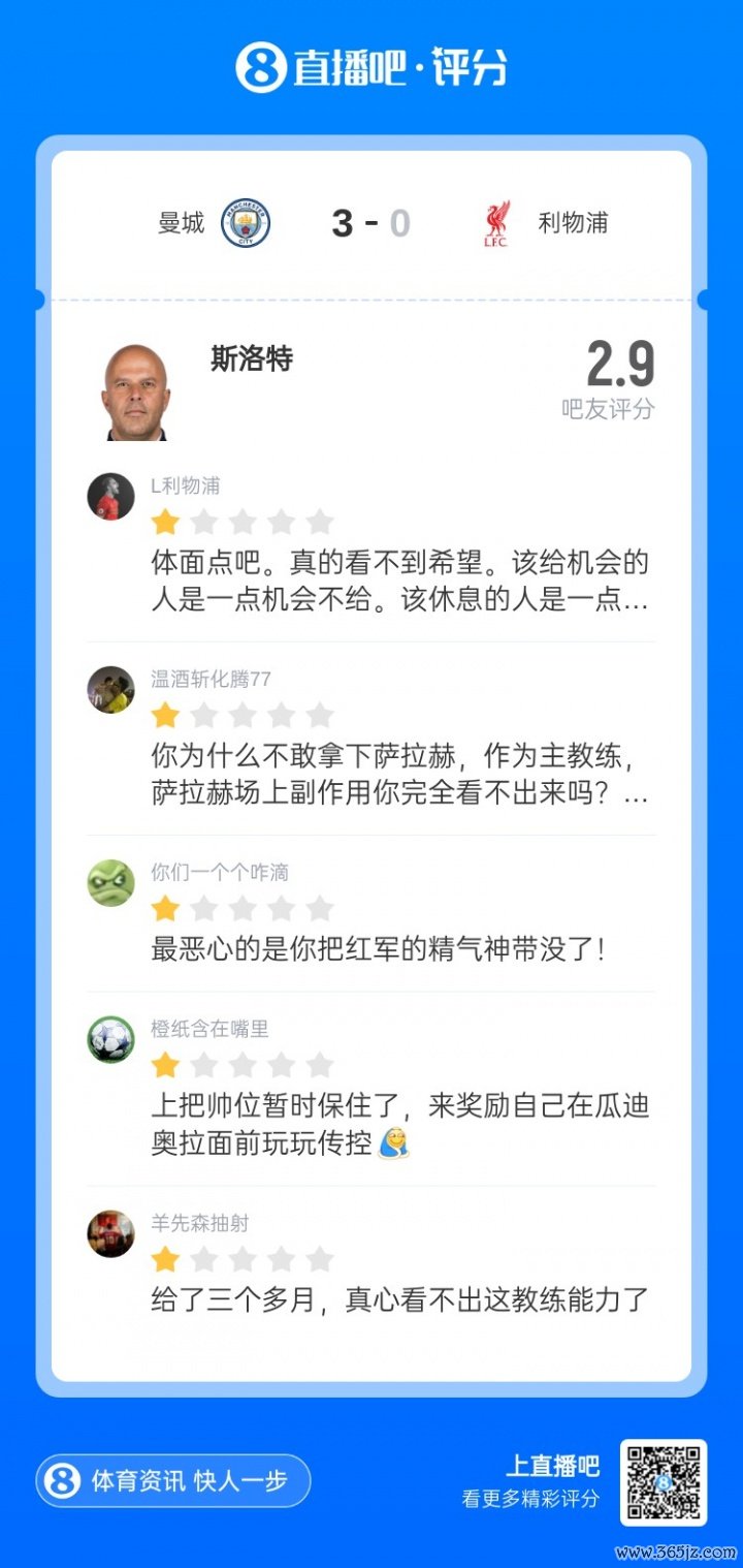 凌晨英超第11轮焦点战,利物浦0-3不敌曼城,近6轮英超吞下5场败仗。利物浦主帅斯洛特本场的政策安排,以及不换下萨拉赫的决定再次遭到球迷责备,吧友们给他打出了2.9分的超低分。