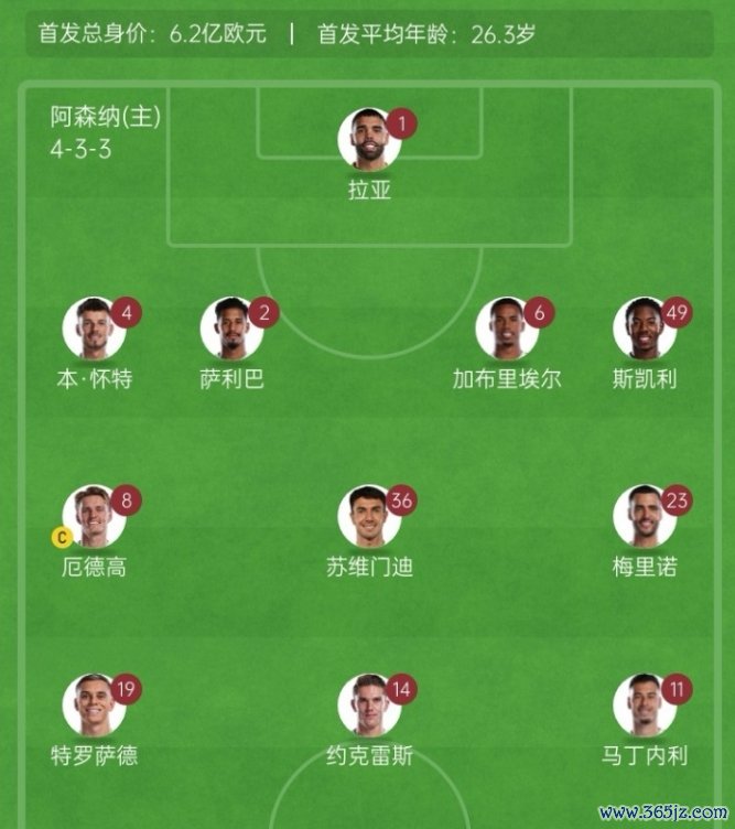 阿森纳vs奥林匹亚科斯首发:1-拉亚、2-萨利巴、4-本·怀特、6-加布里埃尔、49-斯凯利、8-厄德高、36-苏维门迪、23-梅里诺、11-马丁内利、19-特罗萨德、14-约克雷斯