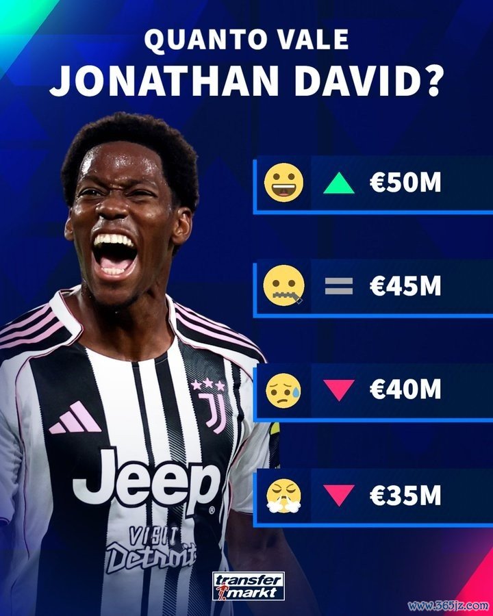 10月6日讯 德国转会市集发布海报,预热了尤文图斯前卫乔纳森-戴维的身价变化。