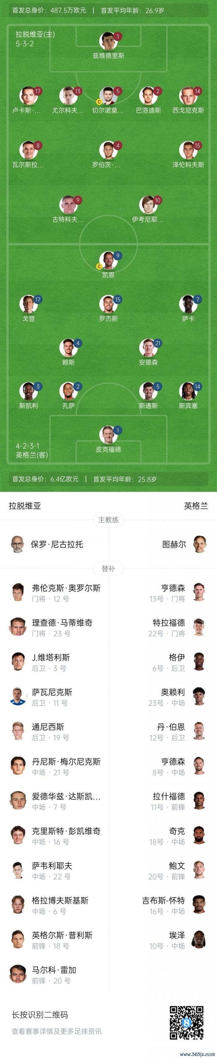 英格兰替补:13-迪恩-亨德森、22-特拉福德、6-格伊、23-奥赖利、12-丹-伯恩、8-亨德森、11-拉什福德、18-奇克、20-鲍文、16-吉布斯-怀特、10-埃泽