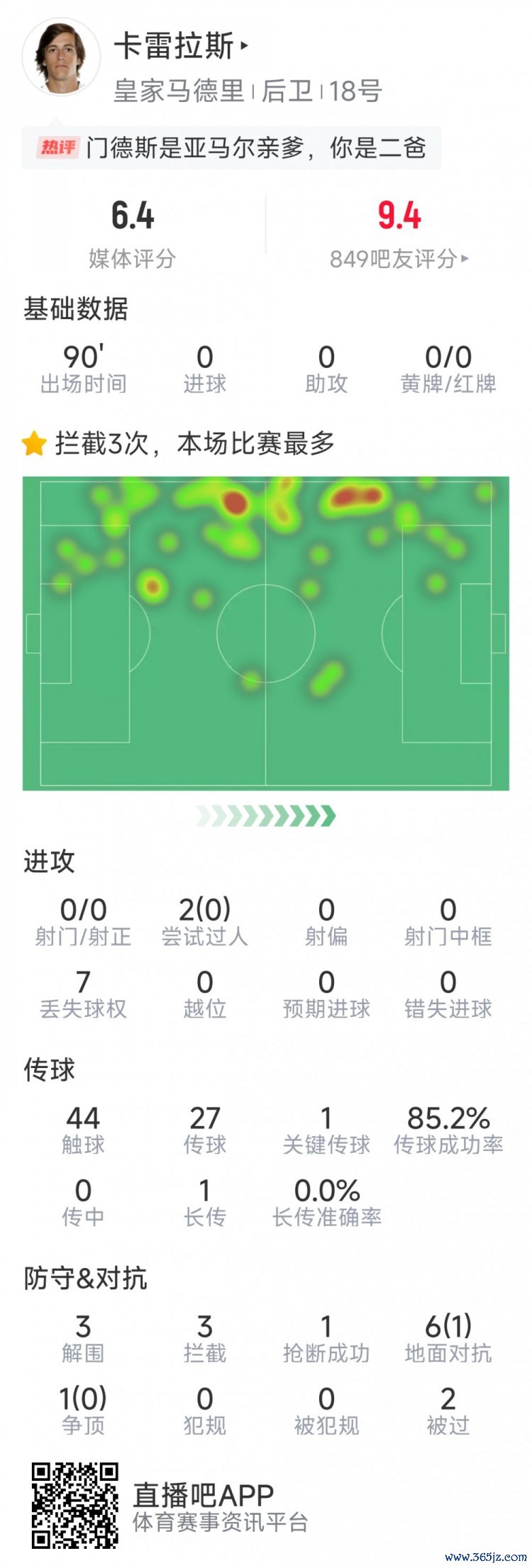 10月27日讯 在本轮西甲,皇马2-1打败巴萨。以下为卡雷拉斯本场数据: