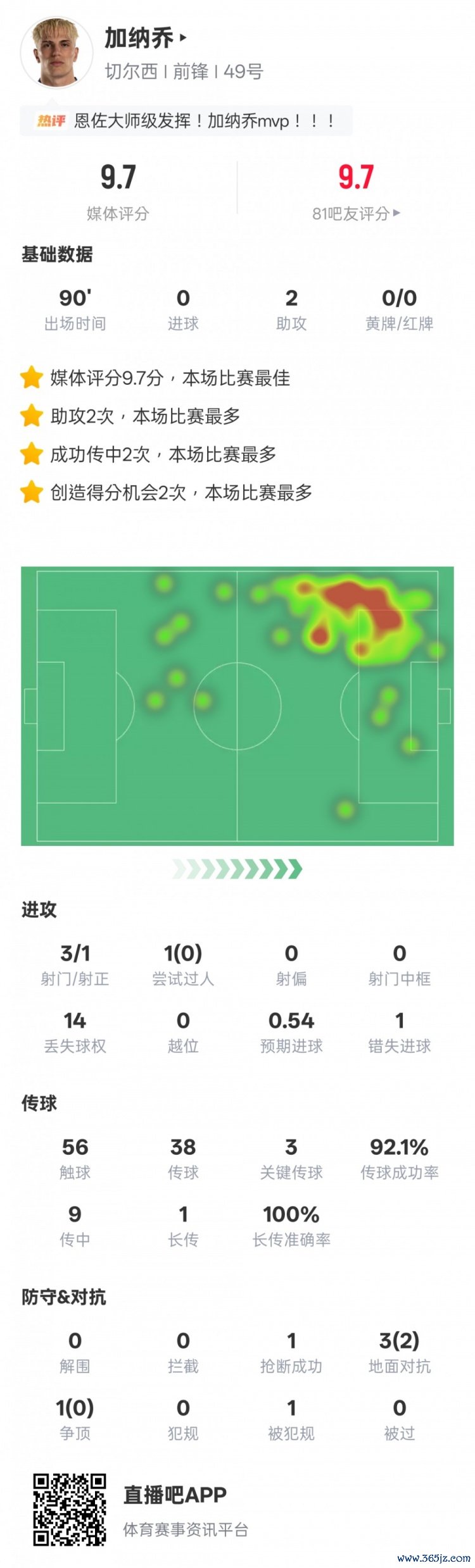 11月9日讯 2025-26赛季英超联赛第11轮,切尔西主场3-0校服狼队。加纳乔首发出战,孝敬2次助攻,送出3次关键传球,传球生效力92.1%,评分9.7全场最高。