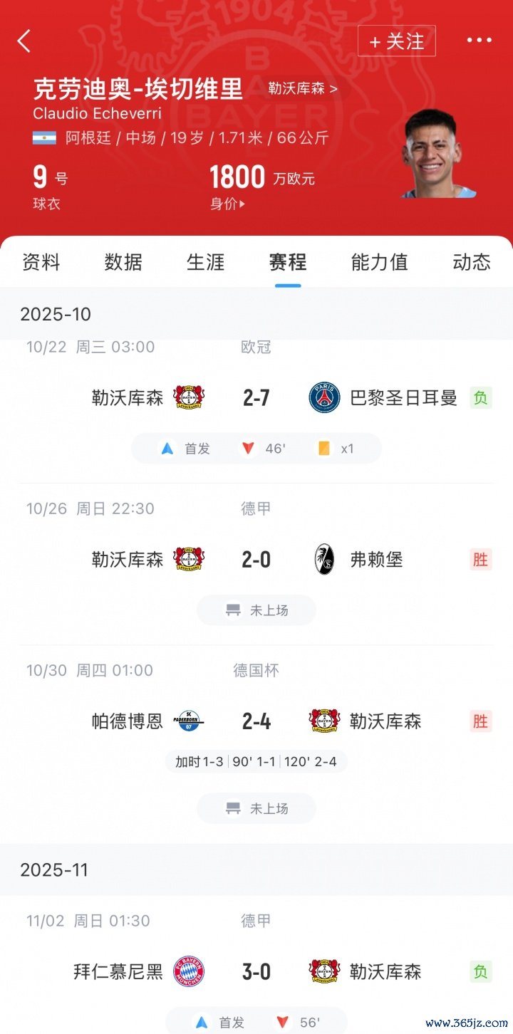 埃切维里从曼城租出至勒沃库森后,现在出战7场比赛,出场本领183分钟送出1次助攻。靠近巴黎和拜仁埃切维里均首发,而德甲靠近弗赖堡和德国杯对阵帕德博恩,埃切维里齐没能获取出场契机。
