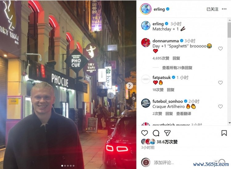 哈兰德社媒晒出溜达街头+吃烧腊的像片,配文:“比赛日第二天。”