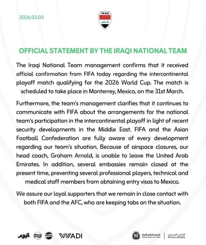 当地时间3月3日,伊拉克宫球协会正式宣布,已收到国际足联关于其参加足球世界足球锦标赛初赛洲际附补赛的正式通知。根据对决组织,该场对决将于3月31日在墨西哥蒙特雷市进行,伊拉克队将与玻利维亚队和苏里南队之间的胜者展开较量,争抢一张2026年美加墨足球世界足球锦标赛的杯赛门票。尽管获得了争抢足球世界足球锦标赛资格的关键机会,但受当前多重因素影响,伊拉克队能否顺利参赛仍面临巨大困难。