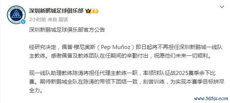 9月30日,深圳新鹏城俱乐部官宣,佩普-穆尼奥斯不再担任一线队主评释。感谢他的团队在职时候的勤勉付出,道喜他们异日一切告成。这些,都是套话。随后官宣助教陈涛将担任代理主帅,率队诞生本赛季余下比赛,不息率东谈主为保级而战。有深圳球迷默示:千古奇冤拉坦皆奥!