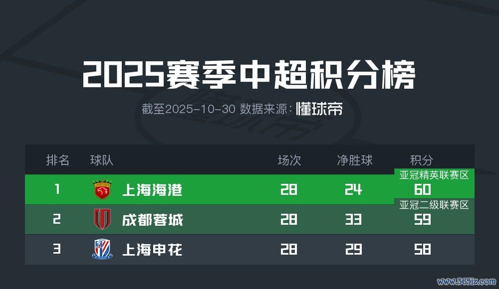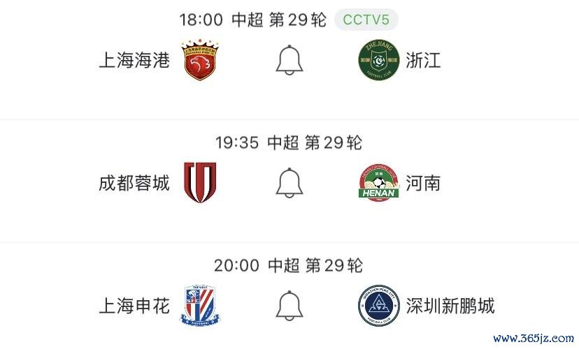 10月31日晚,2025赛季中超联赛第29轮将接连进行3场比赛。18点,领头羊上海海港主场迎战浙江队;19点35分,第二名的成都蓉城主场迎战河南队;20点,第三名的上海申花主场迎战深圳新鹏城。