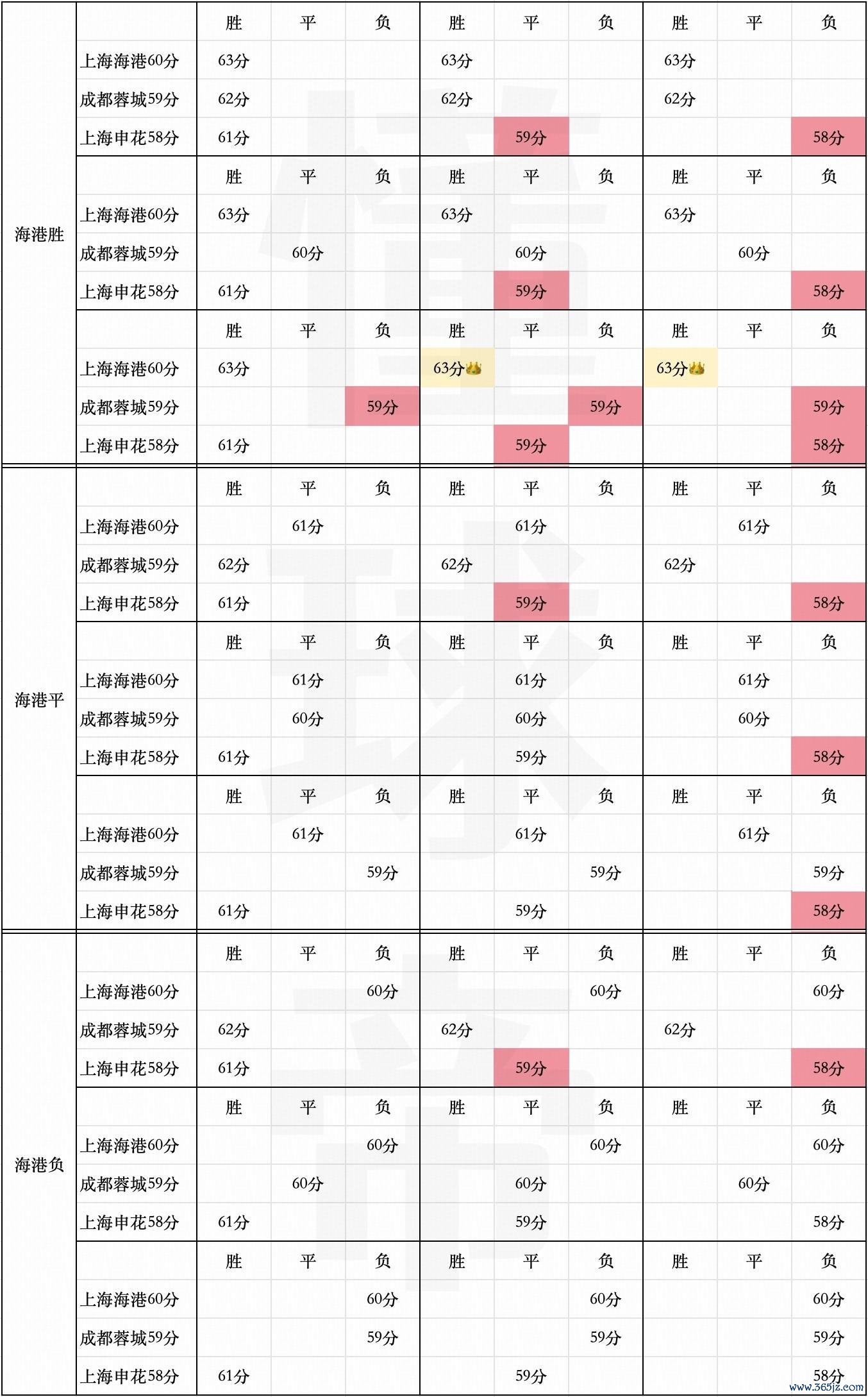 今晚的比赛会产生27种赛果组合,有14种可能是三队到末轮连续争冠,有10种可能是海港与蓉城末轮争冠,有1种可能是海港与申花末轮争冠,有2种可能是海港提前夺冠。